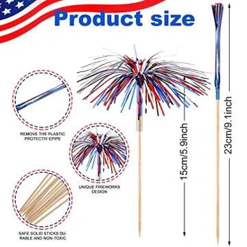 Show more Celebrate your patriotic spirit with these vibrant 4th of July cocktail picks! Specially designed to enhance your Independence Day celebrations, this set includes an impressive 200 pieces of expertly crafted cocktail picks. Ideal for all your festive gatherings, these picks will add a splash of color to your drinks and snacks. Made from quality wood and cellophane, each skewer measures approximately 9 inches in length, perfect for a variety of appetizers and treats.