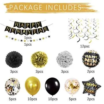 This complete decoration set is your go-to for every corner of your New Year celebration. With a mix of 10 black balloons, 5 gold confetti balloons, and an eye-catching combination of paper pom-poms and foil balloons, your party backdrop will exude elegance and fun. Plus, with the included hanging swirls, you can easily add a festive touch to ceilings or walls, ensuring a cohesive and impressive look!