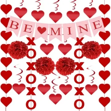 The set includes a delightful mix of decorations: a charming BE MINE banner string, twelve heart swirls, four vibrant paper balls, and two strings of XO and hearts, all measuring approximately 9.8 feet long. This carefully crafted assortment is perfectly sized to bring life to any home or party. With the ease of use in mind, we've ensured that all decorations come pre-assembled, saving you time and effort. The distance between each banner can be adjusted to suit your unique decorating style.