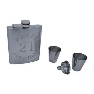 Show moreDiscover the perfect gift for that special 21-year-old in your life with this elegant flask set. This stylish flask holds a generous 7 ounces of your favorite beverage, making it an ideal companion for celebrations and memorable occasions. Crafted from high-quality stainless steel, this flask is designed not only to impress but also to endure, featuring a rust-resistant polished shine that ensures it stays looking great for years to come.