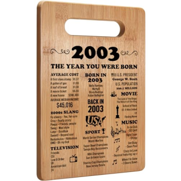 The perfect way to celebrate a milestone birthday, our unique cutting board is a fantastic gift for anyone turning 21. Crafted from natural bamboo, this multifunctional cutting board features fun facts and significant events from the year 2003, highlighting memorable moments from a pivotal year in a young adult's life. Not only is it practical for everyday cooking tasks, whether it's for slicing fruits and vegetables, carving meats, or arranging snacks, but it also serves as a memorable keepsake that adds...