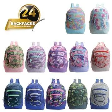 24-Pack 17" Printed Bungee Backpacks for Kids - Bookbags in Bulk for Elementary, Middle, and High School Students, 8 Assorted Colors