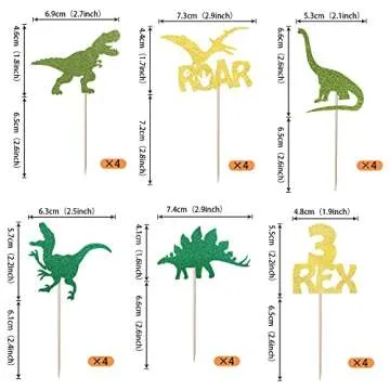 Show moreBring joy and excitement to your next celebration with our **24 Pack Dinosaur Cupcake Toppers**! Crafted with high-quality, single-sided glitter thick card stock, these delightful toppers are designed not only to elevate the look of your sweet treats but also to spark the imagination of little dino lovers. With 6 charming patterns, including adorable dinosaurs in vibrant gold hues, each pack contains 24 cupcake toppers, ensuring you have enough to decorate all your delicious creations effortlessly. They come pre-assembled, allowing you to focus on baking and enjoying the party rather than stressing over the details!