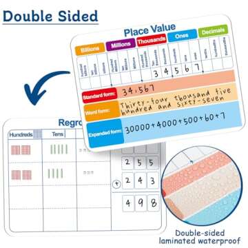 Our innovative design includes double-sided functionality. On one side, students can practice writing numbers from decimals to billions, fostering their ability to manipulate large numerical values. Conversely, the other side is cleverly organized with visual charts, allowing learners to grasp math concepts interactively. This dual-purpose approach ensures an enriching educational experience that caters to different learning styles.