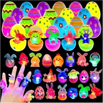 Show morePrepare for an unforgettable Easter celebration with our 24 Pack Prefilled Easter Eggs featuring delightful 3D LED Light Up Rings! These vibrant, colorful eggs are designed to excite and engage children of all ages during their annual egg hunt. Each egg is pre-filled with a randomly selected, eye-catching LED ring that not only provides luminous fun but also enhances playtime through its unique, playful designs. Measuring 2.4 inches, these Easter eggs are made from high-quality, non-toxic plastic, ensuring they're safe for kids to handle and discover.