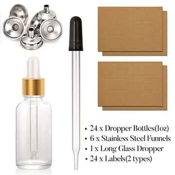 But that’s not all! This package doesn’t just include dropper bottles; it comes with everything you need for complete fluid management. The included **6 stainless steel funnels** are indispensable for filling different liquids without the worry of mixing. A **long reusable glass dropper** is also at your disposal, providing a practical solution for those last few drops at the bottom of your bottles. Plus, we’ve included **24 labels** to help you conveniently identify your mixtures.
