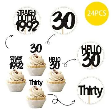 24 PCS Black 30th Birthday Cupcake Toppers Glitter Thirty Straight Outta 1992 Hello 30 Cupcake Picks Cheers to 30 Years Birthday Anniversary Cake Decorations Supplies