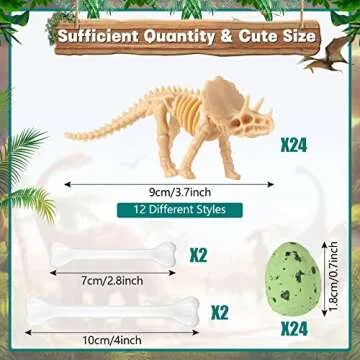 The collection also includes 4 plastic bones, perfect for Halloween decorations or as props in imaginative plays. Each dinosaur skeleton is approximately 3.7 inches long, while the colorful dinosaur eggs measure around 0.7 inches—ideal for small hands. The lightweight construction ensures portability, making it easy for children to take their dino adventure to school, camping trips, or playdates.