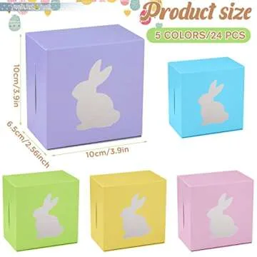 Show moreStep into a world of colorful delights this Easter with our enchanting **24 Pcs Easter Treat Boxes**! Perfectly crafted to enhance your festive celebrations, these whimsical boxes come in a delightful assortment of vibrant colors including **yellow, blue, pink, green, and purple**. Each box measures a convenient **3.9 x 3.9 x 2.6 inches**, striking the perfect size for presenting an array of treats such as cookies, candies, and even small toys. Packaged individually for convenience, these boxes not only fulfill your storage needs but also add a joyful splash of color to your holiday gatherings.