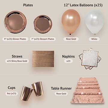 25 Guest Rose Gold Party Supplies Decorations Birthday Dinnerware Set Dinner Plates and Napkins Cups Straws Balloons Supply Table Runner Kit Weddings Bridal Bachelorette Anniversary Baby Shower Adults