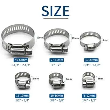 Show moreIntroducing the premium 25 Pack Stainless Steel Hose Clamps, a versatile and reliable solution designed for all your pipe and tubing needs. These adjustable hose clamps are perfect for securing various hoses and pipes ranging from 3/4 inch to 1-1/8 inch (19-29mm). Crafted from high-quality 304 stainless steel, they offer superior corrosion resistance against salt and most chemicals, making them ideal for marine, automotive, and general plumbing applications.