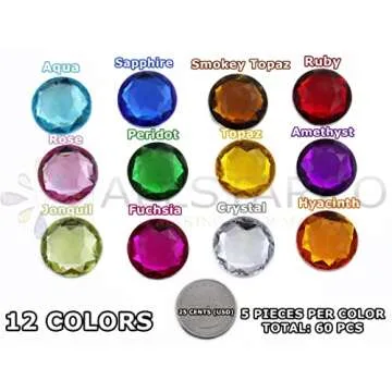 Show more Introducing the vibrant collection of 60 High Quality Lead Free Acrylic Gemstones by Allstarco, perfect for adding a touch of sparkle to any occasion. These meticulously crafted gemstones come in assorted colors, each measuring 25mm or 1 inch with a round point top that makes them stand out brilliantly. The set features an impressive range of 12 different colors, with 5 pieces of each color for endless creative possibilities. The colors included are Gold Topaz, Green Peridot, Blue Sapphire, Red Ruby, Blue Aqua, Pink, Orange Hyacinth, Pink Fuchsia, Purple Amethyst, Crystal Clear, Brown Smokey Topaz, and Yellow Jonquil. This updated version is a must-have for anyone looking to elevate their crafting game!