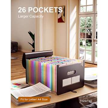Show more Introducing the ThinkTex Monthly Bills Organizer, an innovative and practical solution for decluttering your life! Designed with 26 spacious pockets, this accordion file organizer is both expandable and versatile, adapting perfectly to your growing needs. Made from durable materials, it boasts an intelligent design featuring a closed bottom, ensuring that your documents remain secure and organized in their designated slots.
