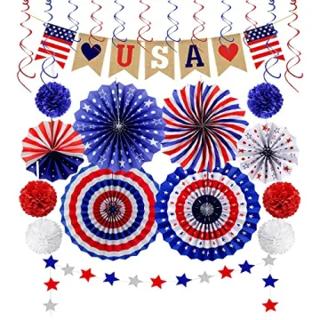 Show moreMake your next patriotic gathering truly unforgettable with our stunning 26Pcs Patriotic Decorations 4th of July Decor! This carefully curated set includes everything you need to create a vibrant and festive atmosphere for your celebrations. With 6 foldable hanging paper fans, 6 colorful paper pom poms (in striking shades of white, red, and navy), and 12 eye-catching hanging swirls (featuring red and blue), your home will instantly transform into a holiday wonderland. To enhance your decorations, the set also includes a delightful banner proudly displaying the message ‘Love USA’ and a whimsical string of star streamers, making it perfect for any patriotic occasion from 4th of July parties to Memorial Day gatherings!