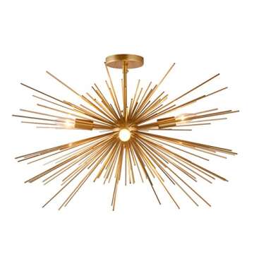 Show moreIlluminate your space with the exquisite 27 Inch Astra Sputnik Semi Flush Mount Lamp. This stunning piece marries contemporary design with mid-century charm, featuring a bold starburst shape that captures and reflects light beautifully. Crafted from high-quality brass-plated metal, it's not just a light fixture, but a statement piece that adds sophistication to any room. With a diameter of 24 inches and a height of 15 inches, it’s perfectly sized to make an impact without overwhelming your decor. Designed to hold four medium base (E12) light bulbs, this lamp allows you to create a vibrant and inviting atmosphere, ideal for living rooms, dining areas, or hallways. Note that bulbs are not included, providing you the freedom to select the perfect style for your needs.