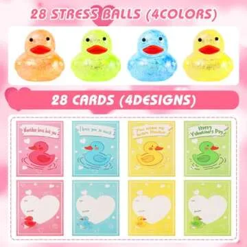 28Pack Valentines Day Gifts Cards with Rubber Ducks Stress Balls, Valentines Day Cards for Kids Boys Girls School Classroom, Bulk Valentines Gift Exchange Squishy Toys for Party Favors Supplies