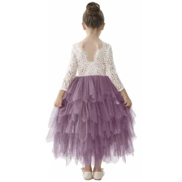 2Bunnies Girl Peony Lace Back A-Line Tiered Tutu Tulle Flower Girl Dress (Mauve Long Sleeve Maxi, 3T)