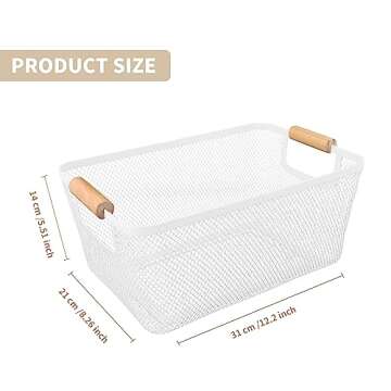 Show moreIntroducing the 2Pack Metal Mesh Steel Basket with Bamboo Handle, a stylish and functional addition to your kitchen organization arsenal! Designed with the modern home in mind, these wire metal baskets not only elevate your decor but also provide a robust and versatile solution for all your storage needs. Crafted from quality steel wire coated in a durable finish, each basket measures 12.2" x 8.26" x 5.5" high, making them ideal for a range of pantry items, from snacks to canned goods, and more. The thoughtfully integrated bamboo handles allow for easy transport, making it effortless to grab and go, whether you're moving items from the pantry to the table or rearranging your kitchen essentials.