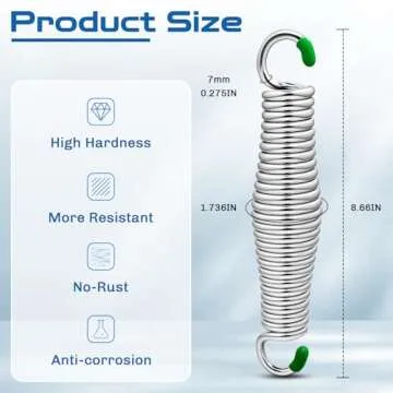 Show more Introducing our exceptional Porch Swing Springs, crafted from high-quality chrome-plated 304 stainless steel. These springs are not just designed for durability but also come with a waterproof and transparent coating, ensuring that they resist rust and corrosion even in harsh outdoor conditions. With a commitment to environmental sustainability, these springs are recyclable, promoting a pollution-free option for your backyard relaxation.