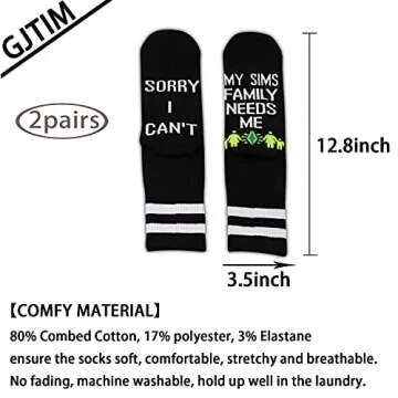 Show moreIntroducing our delightful 2PAIRS Game Gift: I Can't My Sim Needs Me Funny Gaming Socks, specifically designed for the avid gamer in your life. These novelty socks are not just a fashion statement; they embody the spirit of gaming with their whimsical quote, "SORRY I CAN'T MY SIM NEEDS ME". Made from a premium blend of 80% Combed Cotton, 17% Polyester, and 3% Elastane, these socks promise ultimate comfort and durability. They're soft to the touch, stretchy for flexibility, and breathable to keep your feet feeling fresh whether you're on an all-night gaming session or out for a casual day. Forget fading colors—these socks are machine washable and resilient against wear, ensuring they remain vibrant even after repeated washes.