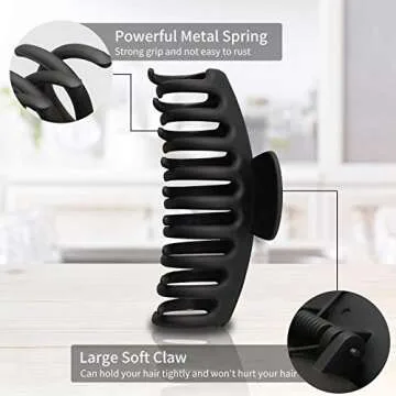 Show more Elevate your hair game with our premium black matte hair claw clips! Made from high-quality plastic and equipped with robust metal springs, these clips are not only durable but also designed to be flexible, ensuring they won't harm your beautiful locks. With a sleek and modern finish, they're perfectly suited for any occasion, whether you’re heading to work, a date, or just running errands.