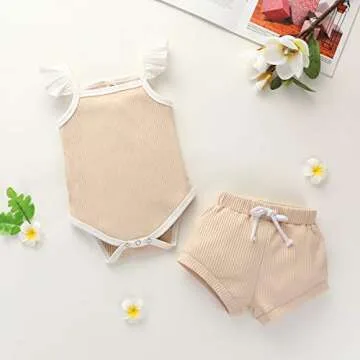 2PCS Newborn Baby Girl Clothes Infant Baby Ribbed Sleeveless Romper Shorts Outfits Sets Beige