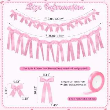 2Pcs Pink Satin Ribbon Bow Banner Garland, Bow Party Decortions, Girls Bow Birthday Decorations, Baby Shower Decorations, Tying The Knot Bridal Shower Bachelorette Party Decor