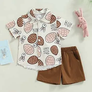 Show more Introducing the adorable baby boy rabbit short set, designed specifically to make your little one shine during special occasions! Crafted from a soft cotton blend, this outfit ensures maximum comfort for your child, making it perfect for all-day wear. The cute design features a short sleeve lapel neck shirt adorned with charming Easter egg and rabbit prints, creating a playful and festive look. Paired with elastic waist solid color shorts that come equipped with pockets, your boy will not only look handsome but will also have the freedom to play and explore.