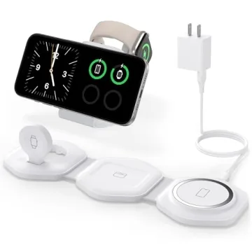Show more Introducing the CINFII 3 in 1 Charging Station for Apple Devices – a revolutionary foldable magnetic wireless travel charger that effortlessly integrates into your life. This compact powerhouse is designed specifically for Apple enthusiasts, ensuring you can simultaneously charge your iPhone 16, 15, 14, 13, 12 Pro Max, Apple Watch, and AirPods without the hassle of tangled cords and multiple chargers. With its streamlined and minimalist aesthetic, it not only enhances your charging experience but also elevates your workspace with style.