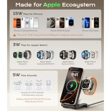 Show moreDiscover the ultimate in convenience and efficiency with the 3 in 1 Magnetic Charging Station. Designed to cater to the entire Apple ecosystem, this innovative charging dock supports 15W Max MagSafe wireless charging for a multitude of devices, such as the iPhone 17 Pro Max, Apple Watch, and AirPods. Avoid fumbling with cords and bulky adapters—this sleek, foldable travel charging dock not only looks stylish but also makes daily charging routines simpler than ever. With its robust magnetic alignment, you’ll experience rapid and reliable charging that keeps your devices powered while you enjoy seamless functionality.