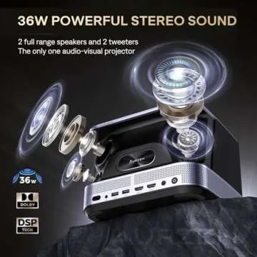 Show more The AURZEN BOOM 3 Smart Projector is a groundbreaking device that transforms any space into a personal cinema experience. Equipped with 2.2 Channel 36W speakers and 3D stereo audio, the BOOM 3 delivers unparalleled sound quality, ensuring every movie night is filled with crisp highs, rich midranges, and booming bass. This projector boasts a smart TV OS that allows you to access over a million videos, enabling seamless streaming of your favorite shows and movies from popular platforms like Netflix, Prime Video, and YouTube without the hassle of HDMI connections or complex setups.
