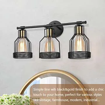 3-Light Farmhouse Bathroom Vanity Light Fixtures, Industrial Black&Gold Cage Vanity Wall Light Fixture, Rustic Vanity Lights for Bathroom Mirror Cabinets Dressing, E26 Socket