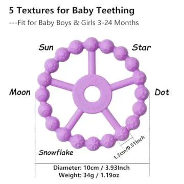 Show more Discover the ultimate solution for your teething baby with the Seposeve 3 Pack Ring Teether Baby Infant Toys. Designed for infants aged 0-24 months, these ring-shaped teething toys are expertly crafted from high-quality food-grade silicone. Featuring five unique textures including a sun, star, moon, snowflake, and dot, these teethers not only soothe sore gums but also entertain your baby. The soft yet durable material provides a safe and enjoyable chewing experience, ensuring your little one can safely relieve their teething discomfort with ease.