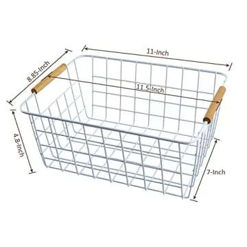 3 Pack Wire Storage Baskets, Storage Baskets Organizing Bins with Wood Handle for Pantry, Bathroom, Freezer White
