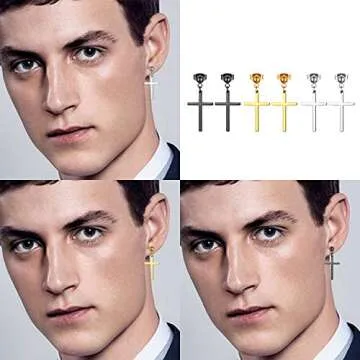3 Pairs Stainless Steel Piercing Ball Stud Cross Dangle Earrings,Silver,Gold,Black