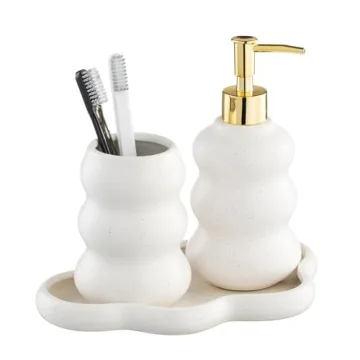 Show moreIntroducing the exquisite Sands of Tranquility 3-Piece Ceramic Bathroom Accessories Set, a remarkable collection designed to elevate your bathroom experience. Inspired by the serene beauty of coastal sand patterns, this stunning set comprises a lotion dispenser, tumbler, and a tray. Each piece embodies elegance and functionality, making it a perfect addition to your home. The unique sand dot glaze creates a harmonious look that blends seamlessly with any bathroom décor, transforming your space into a tranquil sanctuary.