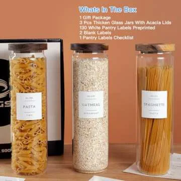 Show more Introducing the perfect blend of functionality and aesthetic appeal, our 3 Set Glass Pantry Storage Jars with Acacia Airtight Lid are designed to keep your pantry organized and stylish. Made from high-quality thick borosilicate glass, these containers boast a capacity of 50 oz, making them ideal for storing pasta, spaghetti, cereals, and more. Their minimalist design, complemented by elegant white labels, makes them not only practical but also a beautiful addition to your kitchen decor. With a wide mouth for easy access and an airtight acacia lid that ensures freshness, you're set for a neat and tidy pantry that brings joy to your cooking experience.