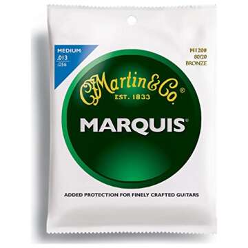 Show moreUnleash your creativity with the Martin Marquis 80/20 Bronze Wound Medium Acoustic Guitar Strings, crafted meticulously for musicians who seek studio-quality sound and durability. These strings, made from a premium brass alloy, bring out the vibrant tones and clarity that every guitarist dreams of. With gauges ranging from 13 to 56, this three-set pack ensures you have the perfect strings for optimal performance, whether you're strumming at home or on stage. Experience the brilliance and longevity of bronze, designed to maintain their rich tone even after hours of playing.