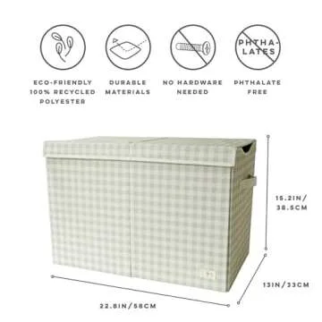 Show more Introducing the 3 Sprouts Recycled Fabric Toy Chest Storage Box, the ultimate solution to your child’s toy organization woes! This extra-large toy storage chest is designed with busy parents in mind who need a spacious, stylish, and sturdy solution for their kids’ toys. Featuring two large compartments separated by a removable divider, this chest allows you to categorize and access all of your child’s favorite items with ease. Not only does it serve a functional purpose but with its modern gingham beige fabric, it also adds a chic touch to any bedroom or playroom.