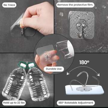 Show moreTransform your space with our 30 Pcs Clear Adhesive Hooks, designed to hold up to 22lbs while keeping your walls pristine. These premium 304 stainless steel hooks are perfect for all your hanging needs, from organizing your bathroom essentials to displaying festive decorations. Their sleek design and transparent finish make them an unobtrusive addition to any decor, seamlessly blending into your home environment. With strong adhesion, you can trust these hooks to securely hold your items without the hassle of nails or drilling, preserving the integrity of your walls.