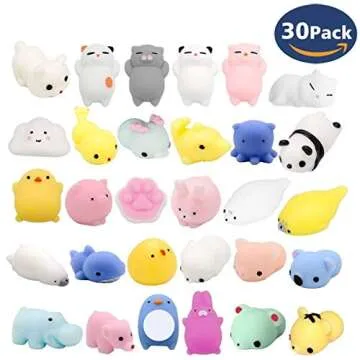 Show more Introducing these adorable and delightful squishy critters that are perfect for both kids and adults alike! These 30 assorted squishies come in a vibrant selection of shapes and colors that are not just visually appealing, but they are also incredibly fun to play with. Made from high-quality materials, each squishy features a soft texture that provides great satisfaction when squeezed, making them ideal as stress-relief toys or simple desk companions.