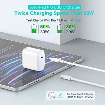 Introducing the 30W USB C Charger, the ultimate power solution for your iPad Pro and other Apple and Android devices. Designed for modern tech enthusiasts, this charger surpasses the standard 20W chargers with its remarkable performance, charging your iPad Pro 12.9 inches up to 30% in just 30 minutes, proving twice the speed. Compatible with the latest iPad models from 2021 to 2024, including the iPad Air 5 and Mini 6, this charger ensures you spend less time waiting for...