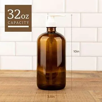 32 Ounce Glass Pump Dispenser Bottle, Large Amber Container with Pump for Shower and Bath Shampoo Soap Conditioner Lotion - 1 Liter - by Kitchentoolz