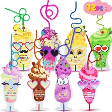 32 Packs Valentines Day Gift Cards with Colorful Crazy Straws for Kids School Classroom Valentine’s Exchange Greeting Cards
