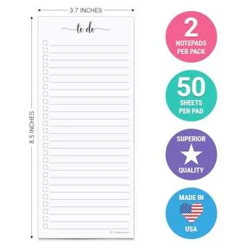 Show more Discover the ultimate solution for keeping your life organized with our premium quality to-do list notepads! Made right here in the USA, these cute, slim notepads stand out for their superb construction and meticulous printing quality. Each pack includes two notepads, and each pad features 50 sheets of 1/3 letter paper, measuring 3.67 x 8.5 inches. The clean, minimalist design is perfect for home, school, the office, or even as a thoughtful gift for that busy friend or family member.