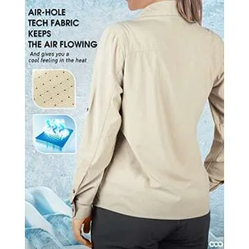 Show moreExperience the great outdoors like never before with the 33,000ft Women's UPF 50 UV Sun Protection Shirt. This exceptional long sleeve hiking shirt is designed for adventurous women who seek comfort and functionality without compromising on style. Crafted from a lightweight, quick-drying air vent tech fabric, it feels incredibly soft against the skin while ensuring optimal breathability. Its remarkable water-resistant features keep you dry, so you can tackle any terrain with ease, making it an essential piece for your outdoor wardrobe.