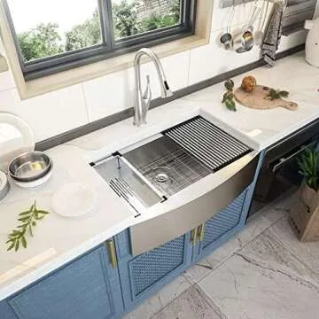 In a market filled with stainless steel farmhouse sinks, the GhomeG 33-inch stands out with its innovative design and thoughtful features. Unlike many competitors, this sink includes built-in tracks for sliding accessories that allow you to maximize your workspace seamlessly. Additionally, its superior 16-gauge construction guarantees it outlasts thinner alternatives, ensuring long-term durability and performance in your kitchen. While other sinks might offer basic functionality, the GhomeG sink transforms how you engage with your kitchen.