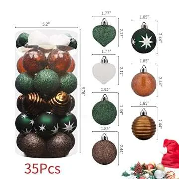 Show more Transform your holiday season with our exceptional Shatterproof Christmas Balls! Crafted from thick and durable plastic, these ornaments combine sturdiness with aesthetic appeal, ensuring they are not only visually stunning but also safe for families. Unlike traditional glass ornaments, our shatterproof design ensures that both you and your children can enjoy decorating the Christmas tree without the risk of breakage. The package contains 35 pieces, including 25 beautifully designed Christmas balls in classic green, gold, and brown, along with 10 exquisite love heart pendants for that extra festive touch.