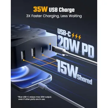 Each USB port is crafted for maximum efficiency, with the **20W USB-C port** offering **fast charging** capabilities, charging your iPhone 14 up to three times quicker than a standard 5W charger. The combined output of **35W** from the four USB ports ensures that all your devices, including tablets and Bluetooth accessories, can be charged swiftly and safely, making it perfect for tech-savvy users and busy households alike.