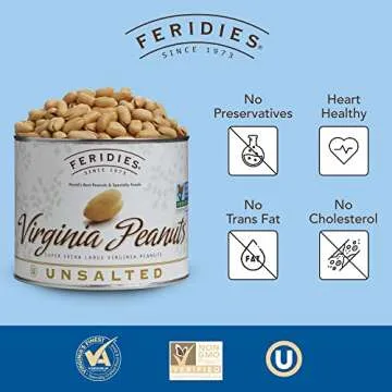 Show moreIndulge in the wholesome goodness of our **36 oz Can Unsalted Virginia Peanuts 2 Pack**. These premium peanuts are crafted for those who prioritize quality and flavor without compromising their health. Sourced from the finest Virginia farms, each peanut is cooked in pure peanut oil to preserve its distinct taste and crunch. **Non-GMO and OU Kosher certified**, these peanuts are perfect for health-conscious consumers, free from cholesterol, trans fats, gluten, sugar, sodium, lactose, and wheat. Enjoy the satisfaction of a deliciously nutritious snack that delights the palate without added salt!